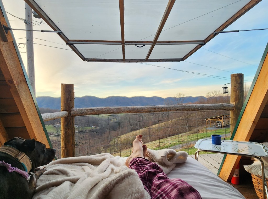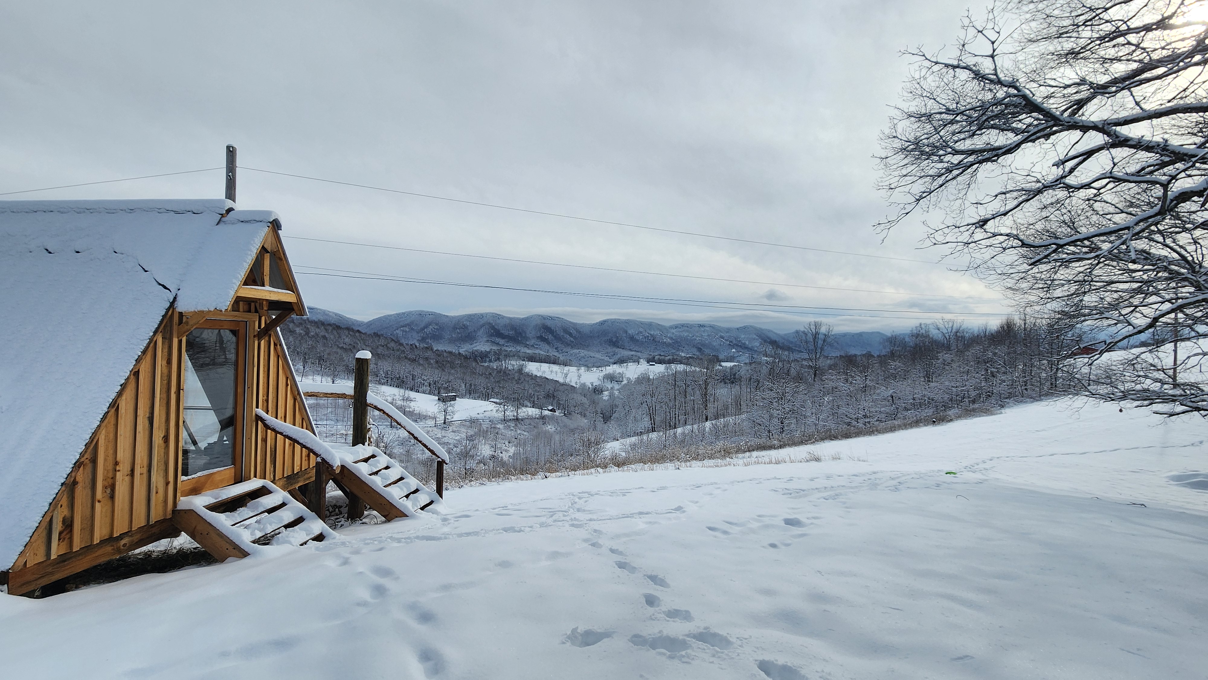 Your Glamping Getaway is waiting for you at our Mountaintop Primitive A-frame cabin farmstay! Located on our 35 Acre Educational Homestead in Rural SW Virginia. Sunrise and sunset views overlooking the Clinch Mountain to the South and rolling mountainscape of the Appalachians to the North. Elevation at your cabin is approximately 2385 feet.