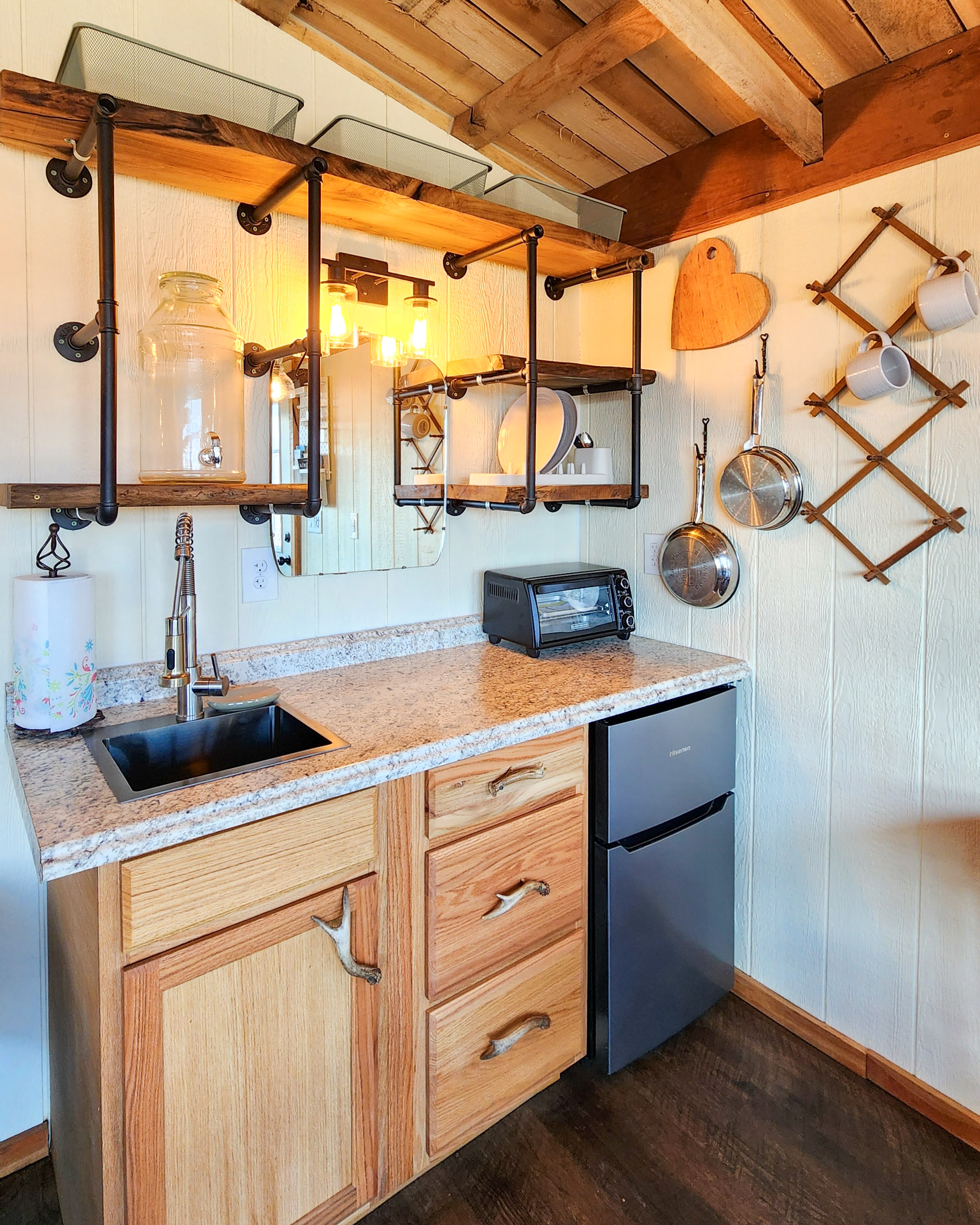 The kitchenette is fully equipped for simple, satisfying meals: custom wood shelving, a mini fridge, a portable cooktop, toaster oven, cookware, dishes, and essential utensils — everything you need for a longer stay or an unhurried breakfast. Coffee and tea are provided to start your mornings right.