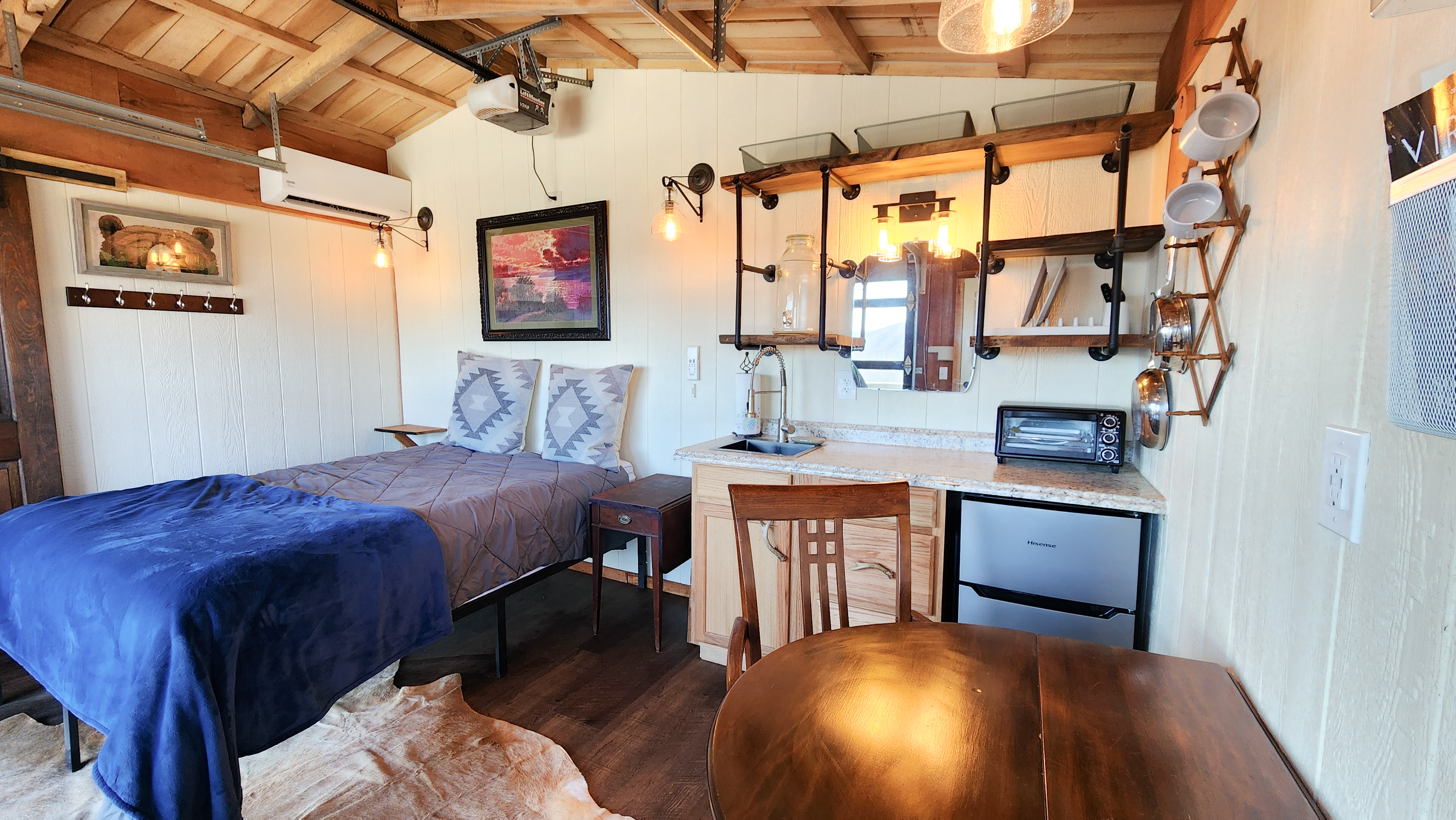 The cabin is designed for one or two guests who want space to truly settle in. The warm, wood-lined interior centers around a queen bed with cozy linens, with the mountains always in view. A cowhide rug, a small dining table, and thoughtful details throughout make it feel personal rather than polished.