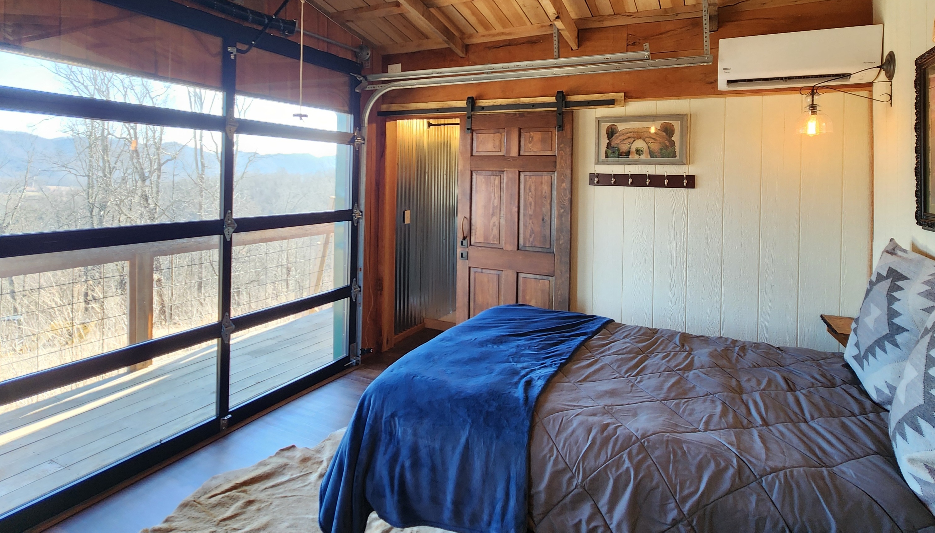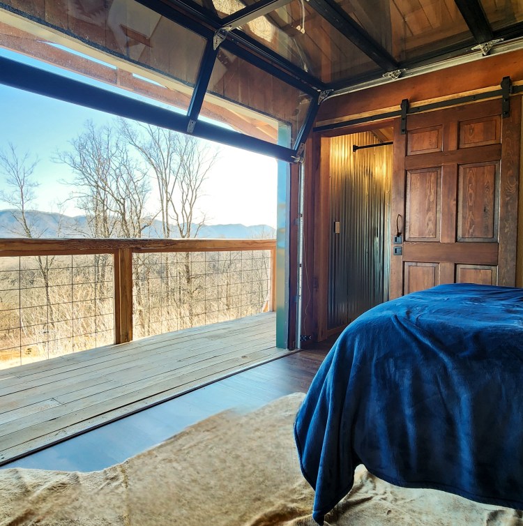 Press a button, and the full glass automated door opens directly from your sleeping area, folding up to reveal the Clinch Mountains in their entirety. Let the morning light spill across the valley while you’re still in bed. Let the mountain air find you before the day does. This is what we built it for.